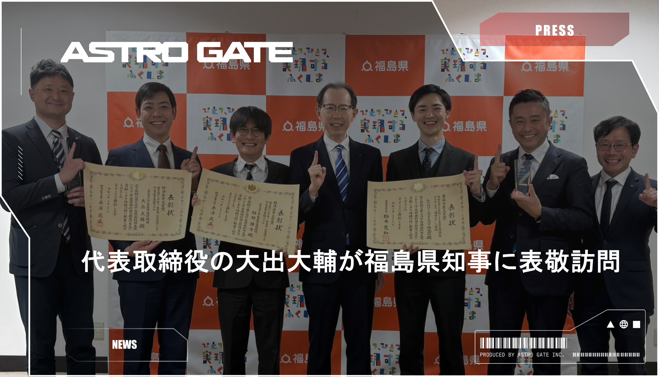 ASTRO GATE株式会社(本社:東京都あきる野市、代表取締役社長:大出大輔、以下「ASTRO GATE」)は、福島県庁を訪問し、内堀照夫知事へ「第7回宇宙開発利用大賞 経済産業大臣賞」の受賞報告を行ったことをお知らせいたします。
